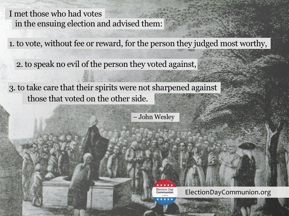 So what does this all have to do with Election Day? A lot. If we are saints of the church, harbingers of the future, then we are called to be a bit different than the world around us. The problem at times, is that we are tempted by the world. The church has a long history of substituting the political agenda of the society around them for the agenda God has given us, one of healing and reconcilation.